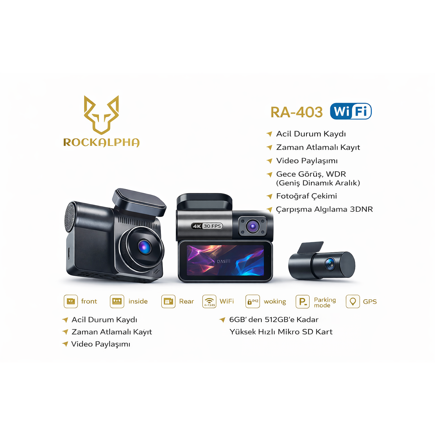 ROCKALPHA RA-403 WiFi araç içi kamera, sürüş güvenliğinizi artırmak ve yolculuklarınızı kayıt altına almak için tasarlanmış gelişmiş bir dash cam çözümüdür. 4K çözünürlükte ön kamera, araç içi kayıt ve 2K arka kamera desteği sayesinde hem dış hem iç hem de arka görüşünüzü net bir şekilde kaydedebilirsiniz.