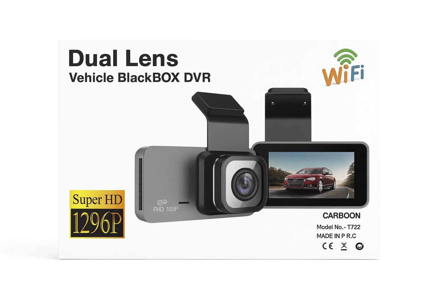 CARBOON T722 Dual Lens Vehicle BlackBOX DVR, yüksek çözünürlüklü 1296P Super HD kayıt kalitesi ve çift kamera lensi ile sürüş güvenliğinizi üst seviyeye taşır.